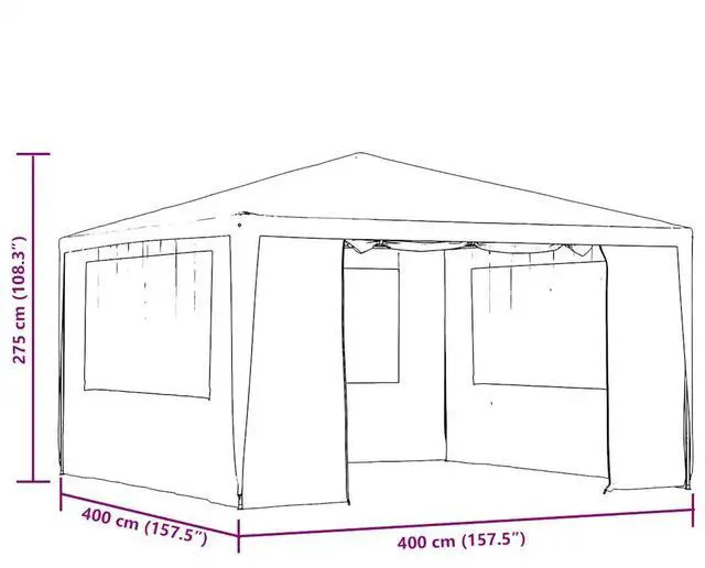 Our partytent provides a wonderful place to entertain your family and friends at all sorts of outdoor parties and get-togethers. The garden marquee is made of UV- and water-resistant polyethylene material and therefore very practical for outdoor use. The frame is manufactured from rust-resistant steel, making the outdoor canopy stable and durable. The party tent has side panels, each with decorative windows, and 1 door panel with a zip for easy entrance. The garden gazebo is easy to assemble.