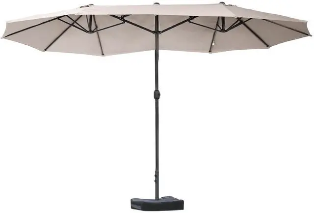 WEATHER RESISTANT: High-quality polyester canopy of this outdoor double umbrella blocks most harmful sunlight and creates a cool shaded atmosphere. The quality polyester material is anti-fading to keep your umbrella looking elegant year after year.