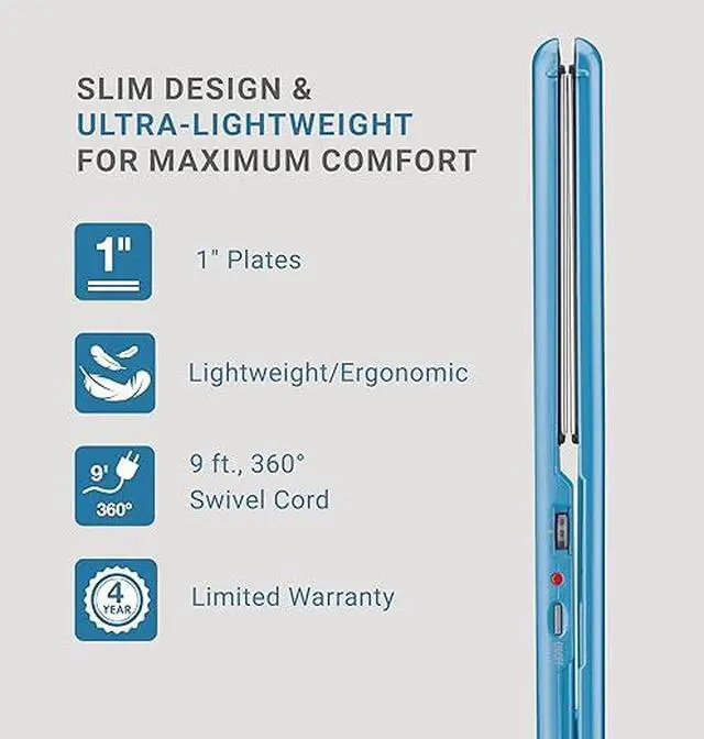 Engineered with Nano Titanium plates, this straightener ensures highly efficient heat transfer for instant smoothing and shining effects on the hair. Its dual voltage ceramic heater provides rapid heat-up and recovery, while the extended 5" plates facilitate faster straightening, catering to various hair lengths. With 50 heat settings reaching up to 450°F, this straightener accommodates all hair types, offering versatile styling options. Designed for maximum comfort, its slim profile and ultra-lightweight construction make styling sessions effortless. The housing is resistant to ultra-high heat, ensuring durability and safety during use. The 9 ft swivel cord adds further convenience, allowing for flexible movement while styling. Backed by a limited 4-year warranty, this straightener guarantees long-lasting performance and reliability.