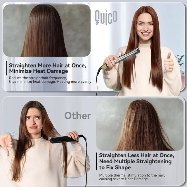 Max Hair Capacity: QUICO straightener features a patented, uniquely curved edge plate design that prevents hair from slipping while gripping and enveloping more strands at once. Compared to conventional straighteners, it cuts styling time by nearly 75%.