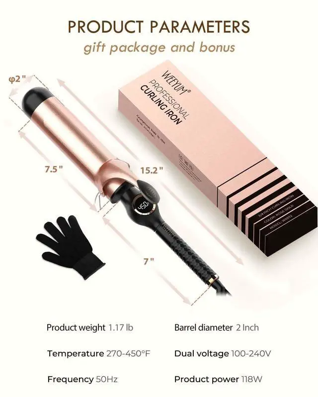 For the curling iron is a 2 inch barrel one. To create long-lasting curls, slightly increase the temperature setting or extend heating time. If heating speed fluctuates (often caused by unstable voltage), wait until the temperature indicator stabilizes before curling.