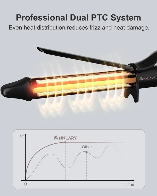 Dual PTC Rapid, Even Heat: Compared with typical single-PTC designs, our Dual PTC elements warm the barrel rapidly and spread heat uniformly along the surface, helping you create consistent curls with fewer passes. Even heating reduces hot spots and helps minimize heat stress on hairgreat for loose waves or defined ringlets.