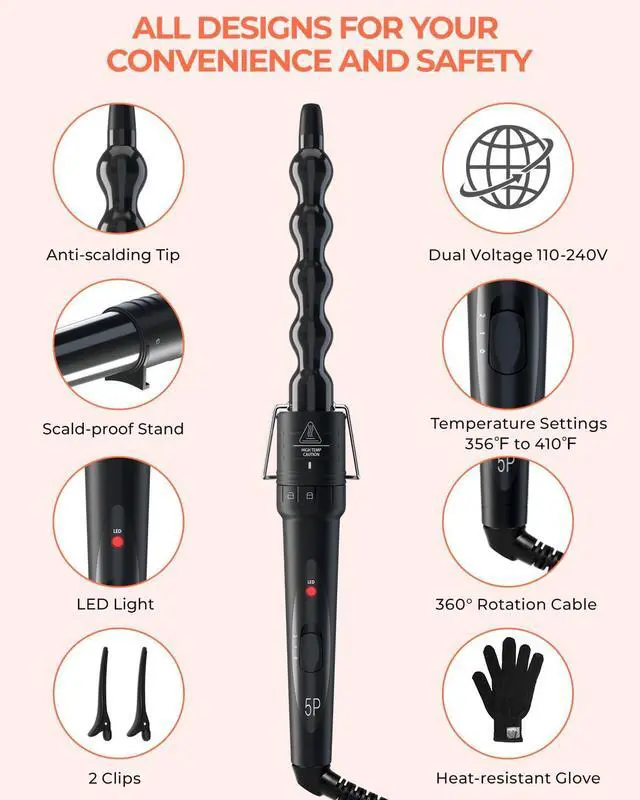 Get the gorgeous hair you've always wanted without running to the salon every week! You can do almost anything with the 5 different sized barrels (0.35-0.7inch, 0.7-1inch, 1inch, 1-1.25inch and 1.25inch). Plus, universal 110v-240v dual voltage, 2 clips, heat-resistant glove and the 360° swivel cord make it travel-friendly, safe and convenient to use. This curling wand is definitely an ideal gift choice for Christmas, a birthday, party, wedding and so much more
