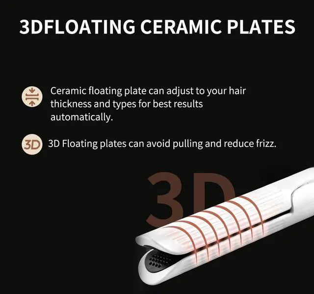 3D floating plates of ceramic coating ensures your hair glides smoothly without snagging or causing frizz