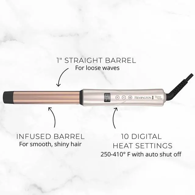 Rejuvenate your hair while you style and create a look that radiates shine and confidence with REMINGTON Shine Therapy. The REMINGTON Shine Therapy Argan Oil & Keratin Infused 1” Straight Barrel Curling Wand features Ceramic Infusion Technology. A combination of antioxidant-rich Argan Oil and protein rich Keratin infused in ceramic creates a smooth radiant shine. The wand heats up in 30 seconds, incorporating styling power with quick convenience. Whether your hair is fine, thick, textured, or color-treated, this styling tool has a heat setting for your hair type. Use with the full suite of REMINGTON Shine Therapy products to achieve your favorite look.