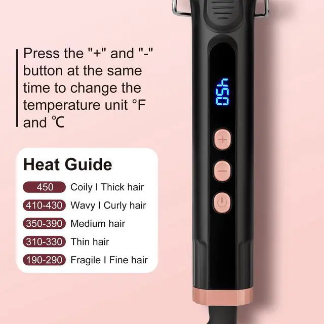 • Easy to UseAdjustable temperature setting, 190-450. You can choose the proper temperature according to your hair type. Suit for long, short and all types of hair. Besides, it provides uniform heat for fast styling, reduce hair damage, make your hair natural to reach salon results