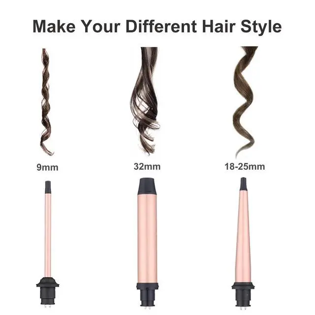 • Professional Curling Wand SetIt comes with 3 pieces of interchangeable ceramic ion barrels in different shape and size: 0.7-1 inch, 1.25 inch, 0.35 inch. allowing you to get different types of curls, from beach waves to tight curls. No salon required, save your money and precious time. Suitable for all hair types from short, medium, and long hair to thin, fine, normal, thick, and coarse hair