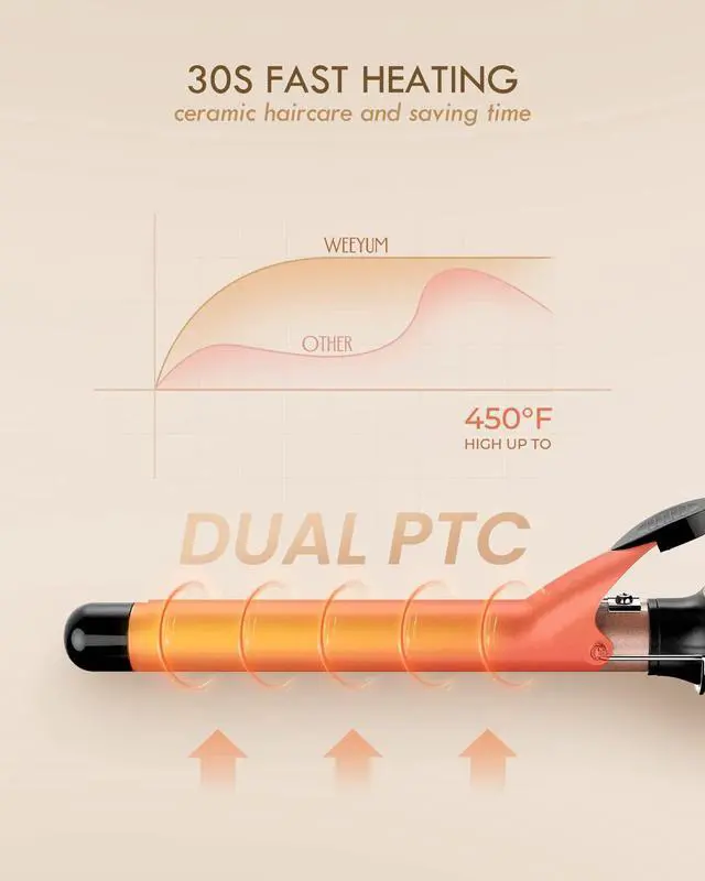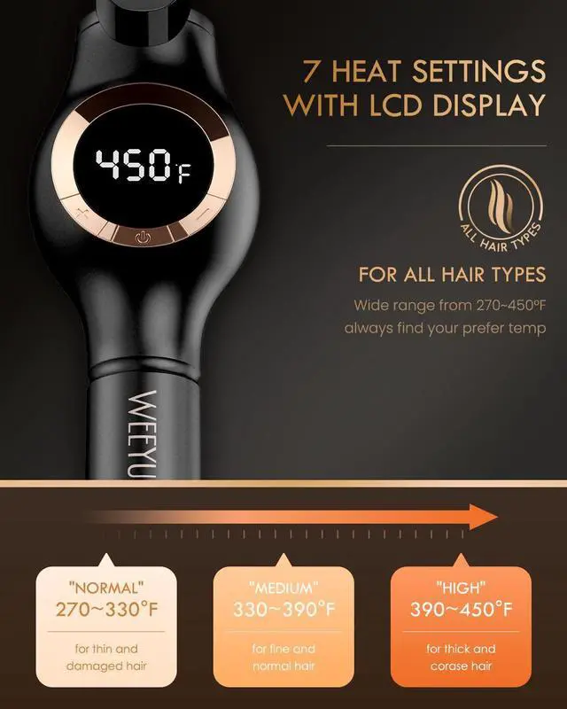 The curling iron has wide range temperature from 270-450?, which can find your prefer heat level easily, suit for all hair types.