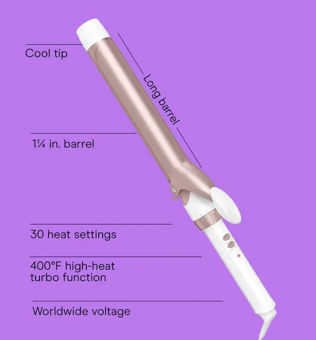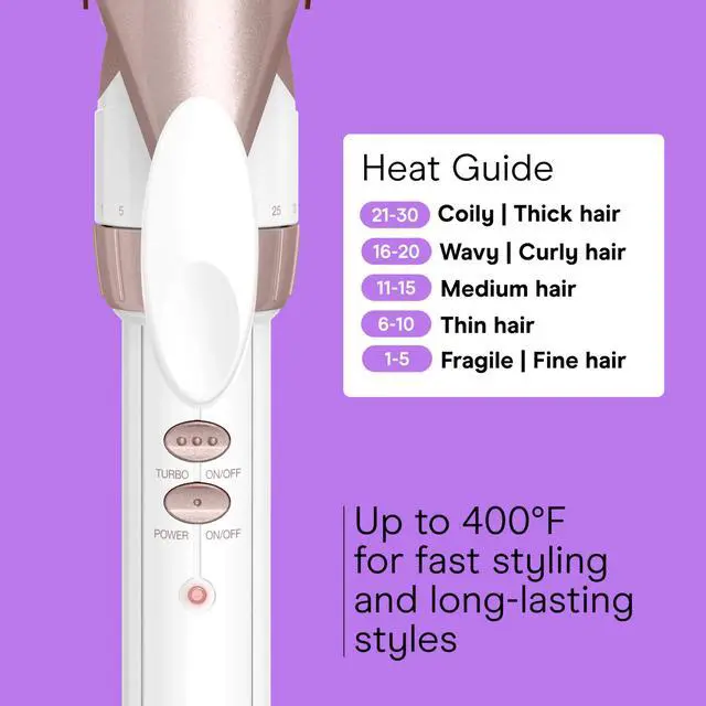 • CUSTOMIZED STYLING FOR ALL HAIR: With 30 heat settings up to 375°F, this Conair double ceramic curling iron caters to every hair type, from fine to coarse. Turbo Heat tackles tricky spots, while the cool tip and auto-off add safety.