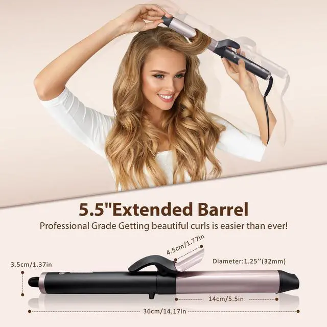 Extended Barrel Size: The curling wand features an extended barrel size of 5.5 inches with a barrel diameter of 1.25 inch, allowing you to style longer hair or create looser waves and curls.