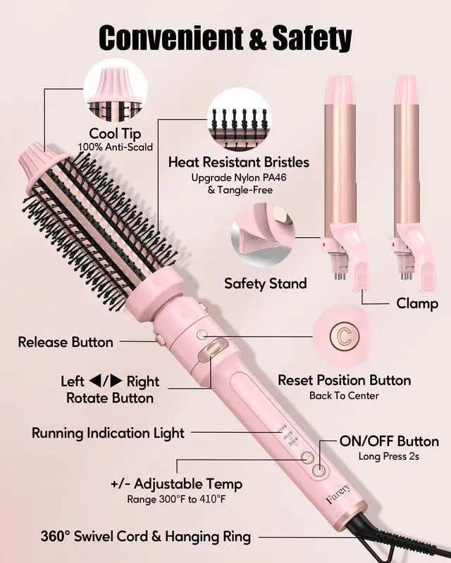• 3 INTERCHANGEABLE BARRELS: Farery 3 IN 1 hair curler set includes three different sizes of interchangeable ceramic barrels: 1 inch, 1-1/4 inch barrel and 1-1/2 inch brush. The curling iron & curling brush makes different hairstyles, meets your most curling style needs