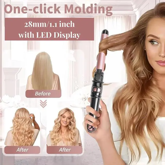 Automatic Curling Wand 28mm/ 1.1 inch Rotating Curling Iron for Short Long Hair LED Display Professional Waver Hair Fast Heating (Rose Gold)