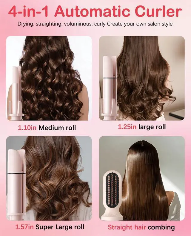 4 in 1 Automatic Curling Iron Set One Tool, Multiple Styles: This 4 in 1 automatic curling iron comes with 1.1in(28mm) 1.25in(32mm) 1.57in(40mm), interchangeable barrels and a straightening brush, allowing you to create tight curls, loose waves, big volume curls or sleek straight hair for daily styling, parties, weddings and travel
