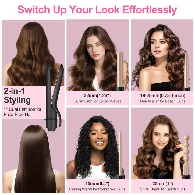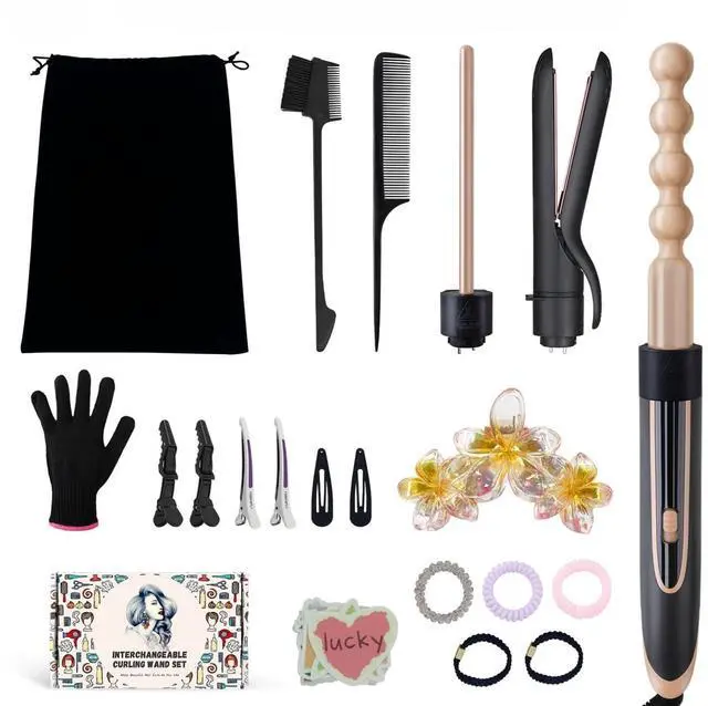 All-In-One Curling Wand Set 1-Stop Styling Solution This versatile kit includes a free storage bag, 3 interchangeable ceramic barrels(0.4" hair curler, 1" hair curler, 1" Flat Iron), a Curling iron base, 1 x heat-resistant glove, and 15 essential styling accessories1 x Edge Brush Double Sided, 2 x Duck Bill Clips, 2 x Alligator Clips, 5 x Hair Ties, 1 x Flower Claw Clips, 2 x Barrettes, 1 x Comb, 50 x Stickers. Everything you need for loose waves, tight ringlets, or textured crimps in one box, making this Curling Iron the ultimate crimper hair tool and wand curling iron combo for daily styling or special occasions;