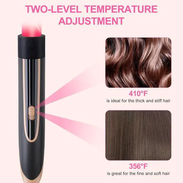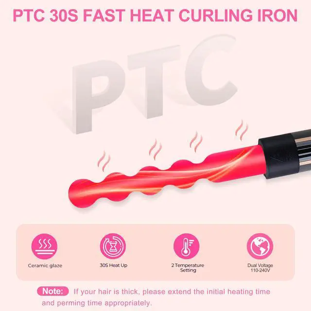 30-Second Rapid Heat & 2 Precision Temps Fits All Hair Types Our wand curling iron heats up in just 30 seconds (PTC heating tech!) with 2 optimized settings: 356 for fine/soft hair (gentle heat to avoid breakage) and 446 for coarse/hard hair (powerful heat for long-lasting curls). This Curling wand provides stable heating, boosts shine, and doubles as a handy crimper hair tool;