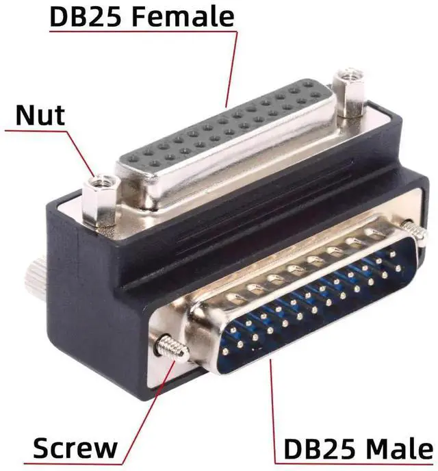 The 25Pin male with nuts and the Female with Screws. 25 pin density plug to socket adaptor. Two rows contacts 90 Degree Angled Adapter.