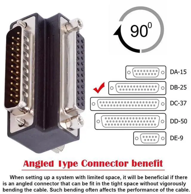 • The 25Pin male with nuts and the Female with Screws. 25 pin density plug to socket adaptor. Two rows contacts 90 Degree Angled Adapter.