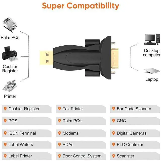 Easy Connectivity. USB to RS232 adapter works with modems, ISDN Terminal Adapters, digital cameras, label writers, palm PCs, PDAs, cashier register, CNC, PLC controller, tax printer, POS, bar code scanner, and devices with DB9 SERIAL ports. NOT compatible with Cutting plotter,SCM