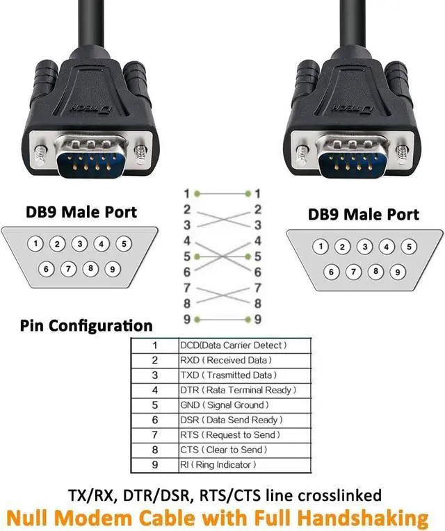 9 pin 2 row DB9 male to male connector on each end equipped with screws to ensure an easy and solid nullmodem cord connection for stable serial cross data communication (Not 15 pin 3 row VGA cord)