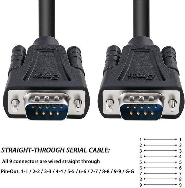 long COM port RS232 cord is shielded with AL foil and all 9 pins are wired STRAIGHT THROUGH pin-to-pin (pinout: 1-1, 2-2, 3-3, 4-4,......, 8-8, 9-9, G-G)