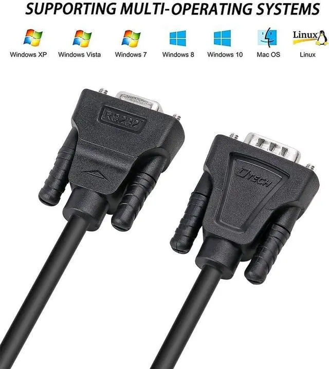 9 pin 2 row DB9 male to male connector on each end equipped with screws to ensure an easy and solid nullmodem cord connection for stable serial cross data communication (Not 15 pin 3 row VGA cord)