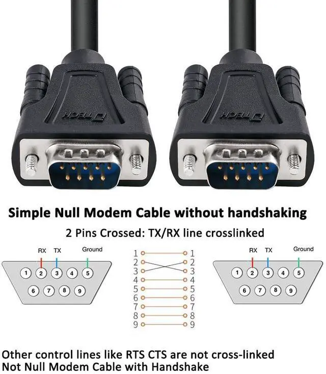 9 pin 2 row crossover serial cable is wired as DE9 serial Null-Modem cord that 2-3 line are crosslinked (only TX/RX data and signal ground wires connected); standard shielded rs232 cord with AL foil