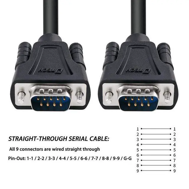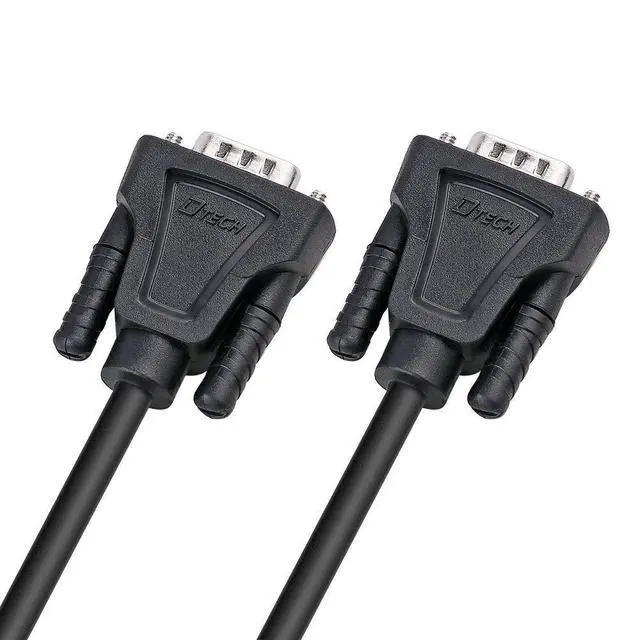 Black male to male serial cable DB9 connector on each end equipped with screws to ensure an easy and solid connection for stable data communication