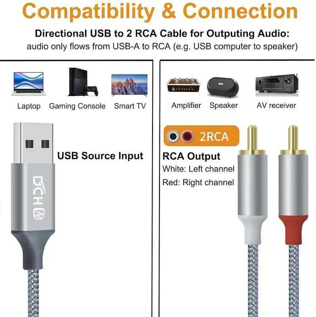 Type A USB to RCA audio cable links computer laptop, smart TV or PS4 gaming console to DAC, speaker, A/V receiver, home stereo audio system (USB digital to RCA analog converter, not bi-directional)