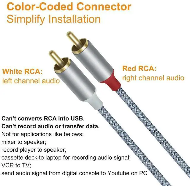 4 feet USB to RCA cable with color-coded red and white phono connectors help you simplify installation (red RCA plug for right channel, white RCA connector for left channel audio)
