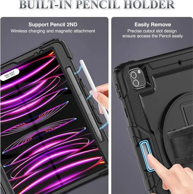 Cut-outs / Pencil Holder / Dust-Proof: The case for iPad Pro 12.9 inch allows easy access to all buttons, controls and ports without having to remove the tablet from the case; The pencil holder helps you storage pencil in the case for handy use, and the port plugs keep dust away from entering into device