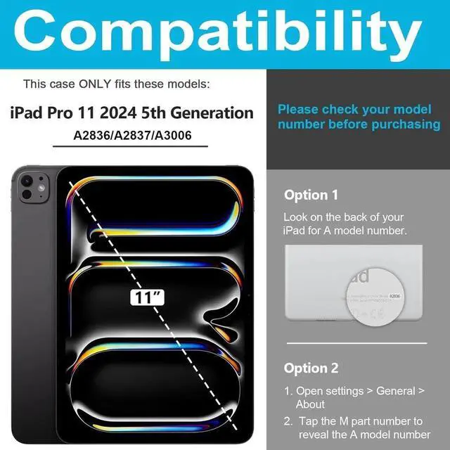 Compatible with iPad Pro 11 Inch M4 2024 : Only designed for iPad Pro 11 inch 5th Generation 2024 Release(Model Number: A2836/A2837/A3006) .NOT compatible with any other model devices.