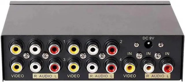 • 4 way RCA composite video splitter 1 input 4 output splits one audio video analog signal into multi TV monitors / power speakers for multiple viewing monitors or dubbing projects