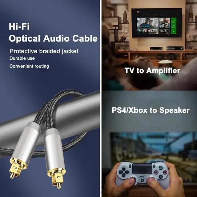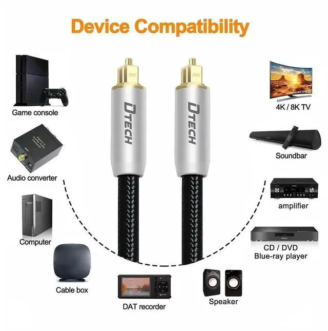 SPDIF optical audio cable is compatible with HDTV, video game console (PS3/PS4/PS5/Xbox), compact disc player, MiniDisc deck, professional-grade DVD Blu-ray player, TV streaming/cablebox to sound bar, mixer, receiver amplifier, computer sound card, powered speaker amp, home cinema amp systems, DAT (Digital Audio Tape), D/A converter, etc.