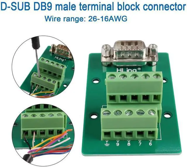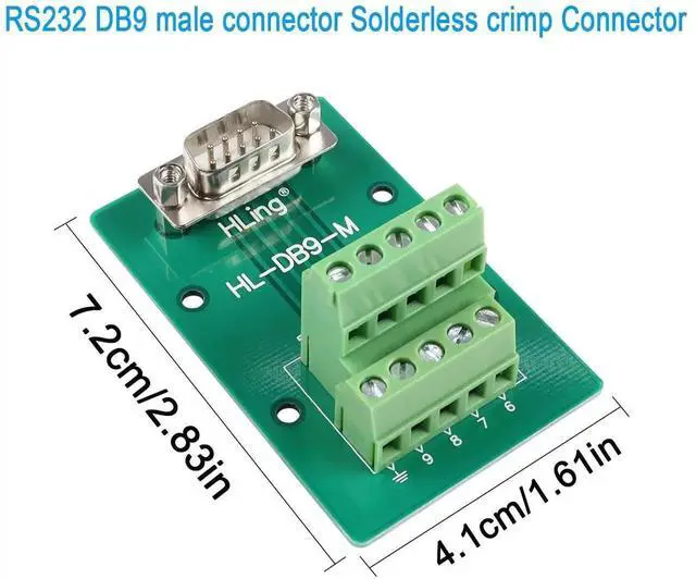 RS232 DB9 male to terminal block Connector breakout boards. for custom development of input/output configurations for DB9 serial communication systems. You can use it to connect I/O serial lines to the DB9 connector. For prototyping, troubleshooting or testing of RS23 serial interfaces, also for applications in PLC control, servo motor, CNC controller wiring. Quick wiring via screw crimp terminals to save you from the hassle of soldering.