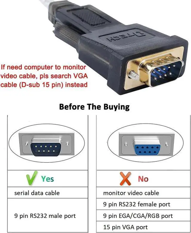 9 pin serial to USB cable male to male port allows PC to connect serial RS-232 devices and programs that communicate through COM port (NOT VGA-Monitor-Video-Cord )