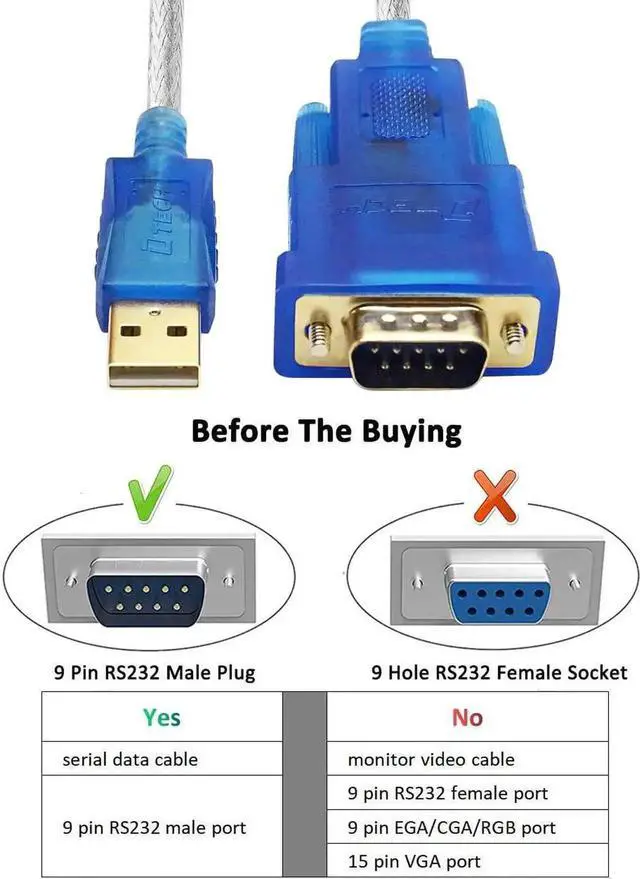 10ft DB9 RS232 to USB adapter with 9 pin male to USB-A male gold plated connector uses crystal clear blue enrich injection, strong and beautiful; active pins: 2(RXD), 3(TDX), and 5(GND)