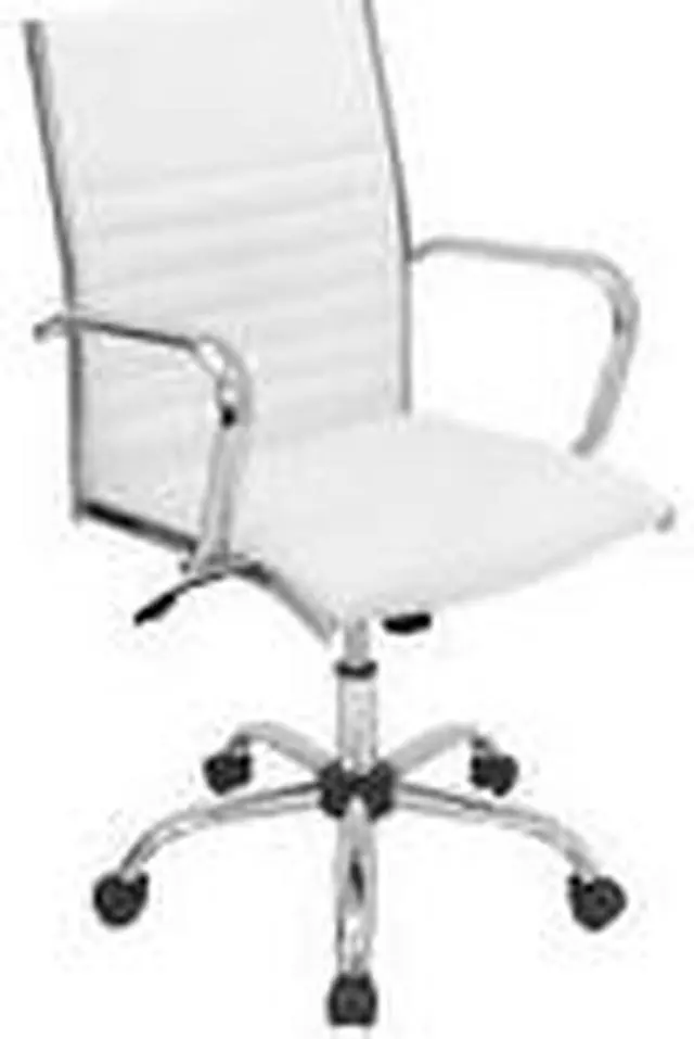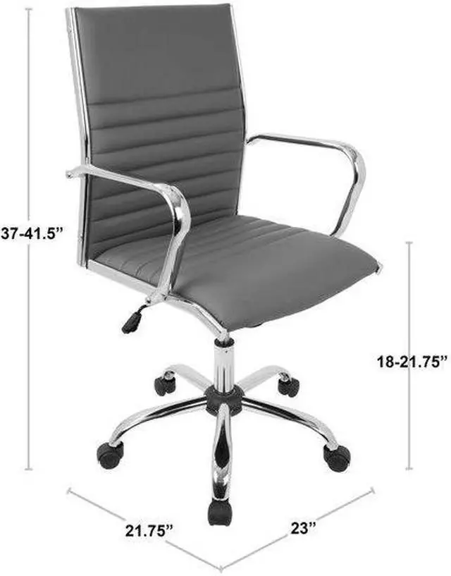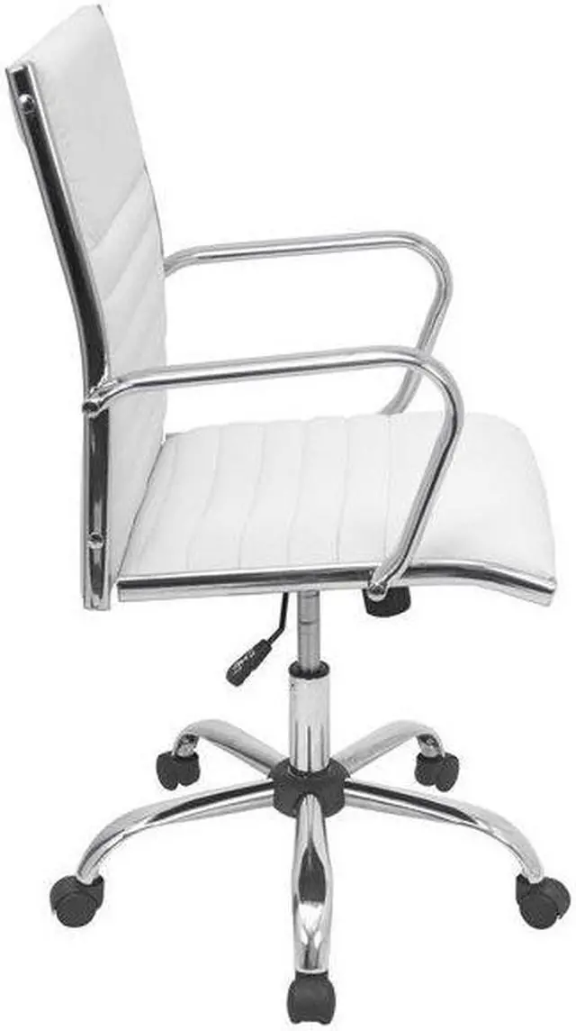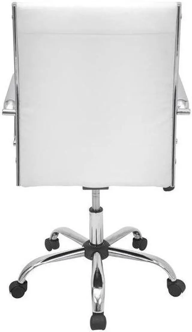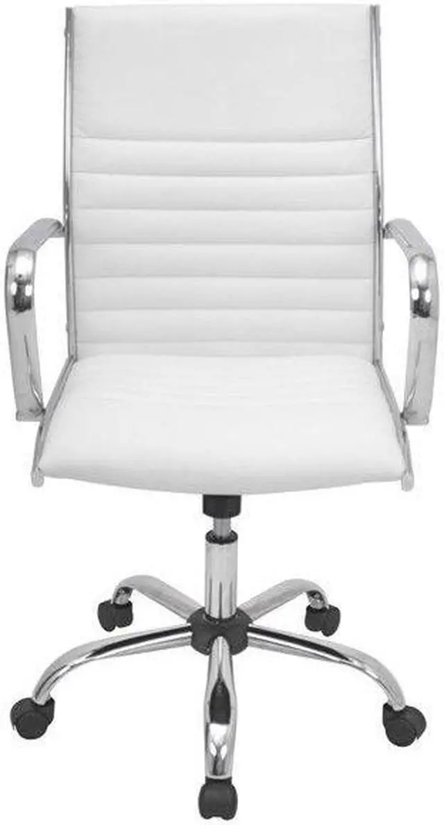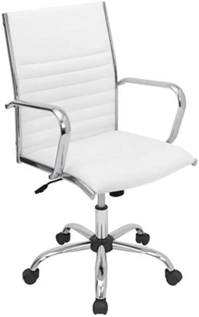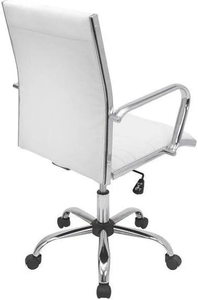 A classic look redesigned for modern appeal. The slightly angular back adds support and style to this leatherette covered office chair. The polished chrome arms and feet makes this whole package complete.Size: 21.75- L x 23- W x 37.75- - 41.5- H.Seat Height: 18- - 21.75-.Color: White.