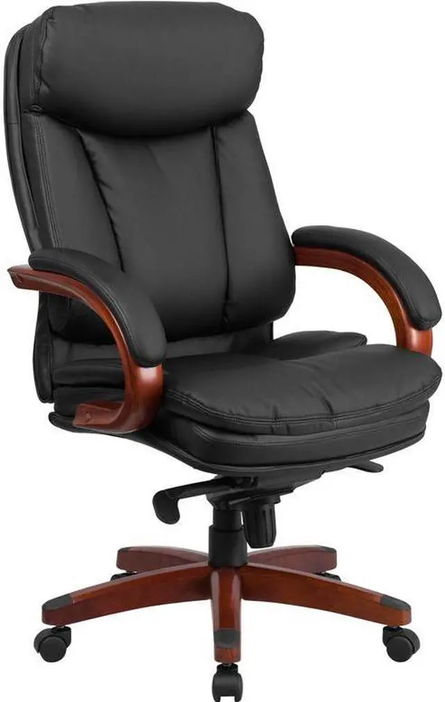 You may have to work but you can do it in style with this ergonomic executive office chair. With features like contoured cushions, a plush headrest, and mahogany wood accented arms and base this chair will upgrade any workspace. Having the support of an ergonomic office chair may help promote good posture and reduce future back problems or pain. High back office chairs extend to the upper back for greater support and relieve tension in the lower back, preventing long term strain. The 2-to-1 synchro tilt control mechanism allows the chair's back and seat to recline at different rates, increasing the angle between your torso and thighs while the tilt tension adjustment knob adjusts the chair's backward tilt resistance.