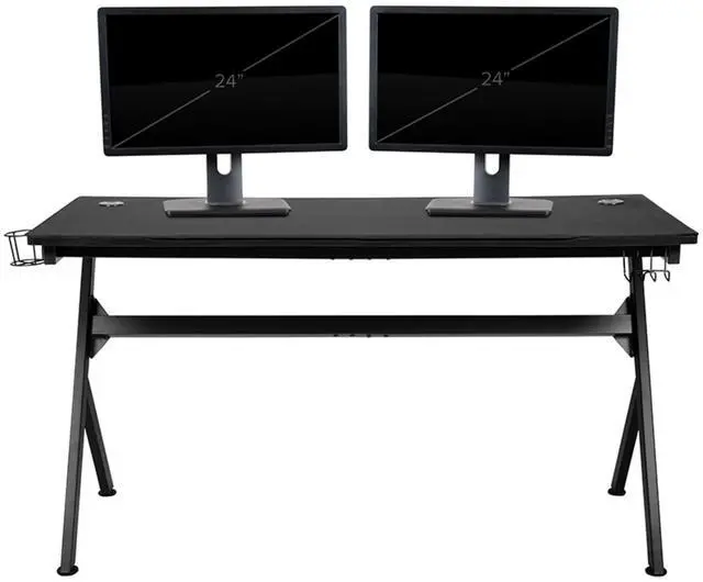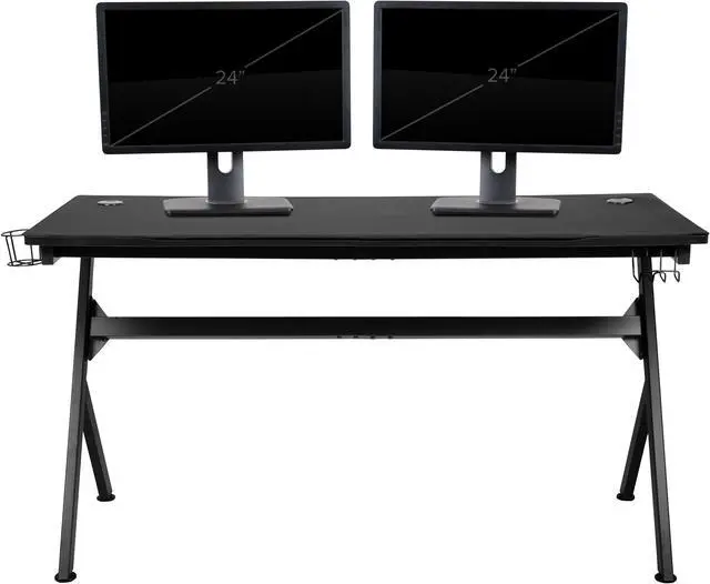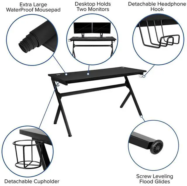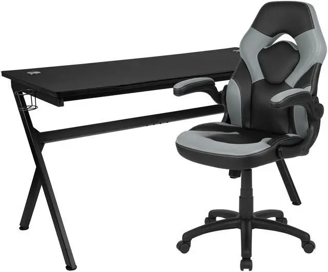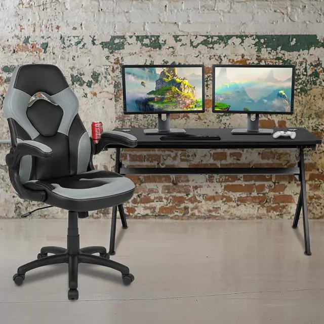 Let the games begin on this gaming desk and chair set. The extra large black top gamers table has 2 grommets for cable management, removable mouse pad top, a detachable cup holder and headset holder to keep you in game mode. The racing game chair have flip-up arms to comfortably rest your arms on while handling the controller or flip-up to slide under the desk. Be true to the gaming experience with a desk and chair combo designed for gaming systems. This PC gaming desk has ample space for dual monitors. Use the cup holder to prevent beverages from spilling on your pc gaming keyboard. The comfortably padded ergonomic gaming chair has a full swivel cylinder and adjusts with the pneumatic lever. Tilt back with ease by pulling the lever outward, control the force needed to recline by turning the knob underneath the seat. Made for gamers, this gaming desk and chair bundle will get you on your way to leveling up.