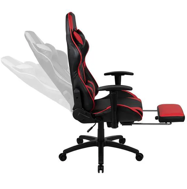 You're going to enjoy playing on this high-performance racing gaming chair with slide-out footrest. This modern gaming chair is paired with an ergonomic gaming desk. If you sit for hours in an office chair you need a gaming chair that is comfortable, and this chair includes adjustable and removable headrest and lumbar pillows. For maximum support this office chair with footrest engages by pulling the loop then flipping the footrest up to elevate your feet and has a separate lever to recline the back 87