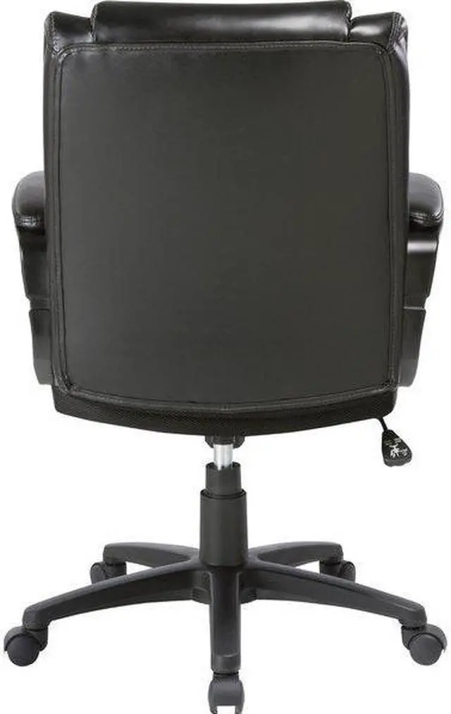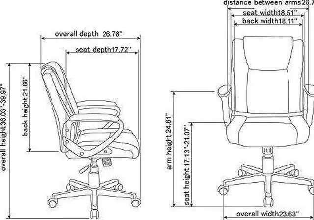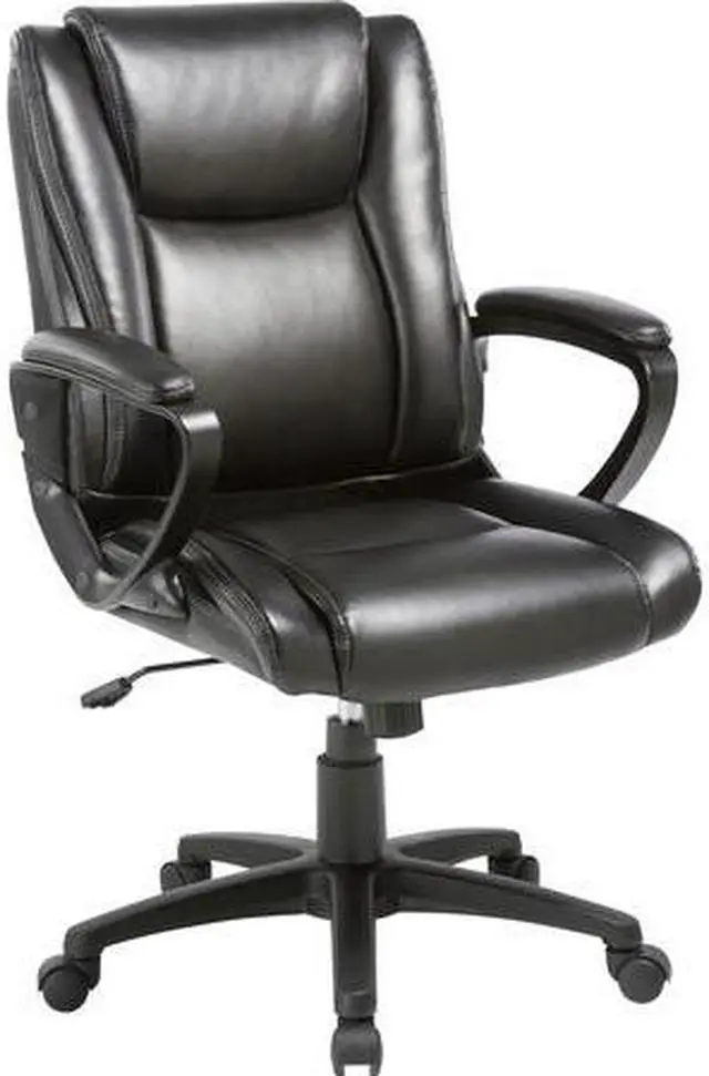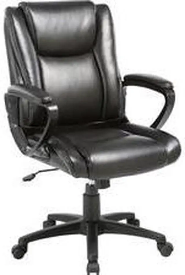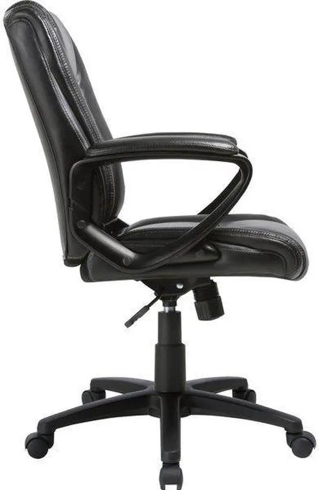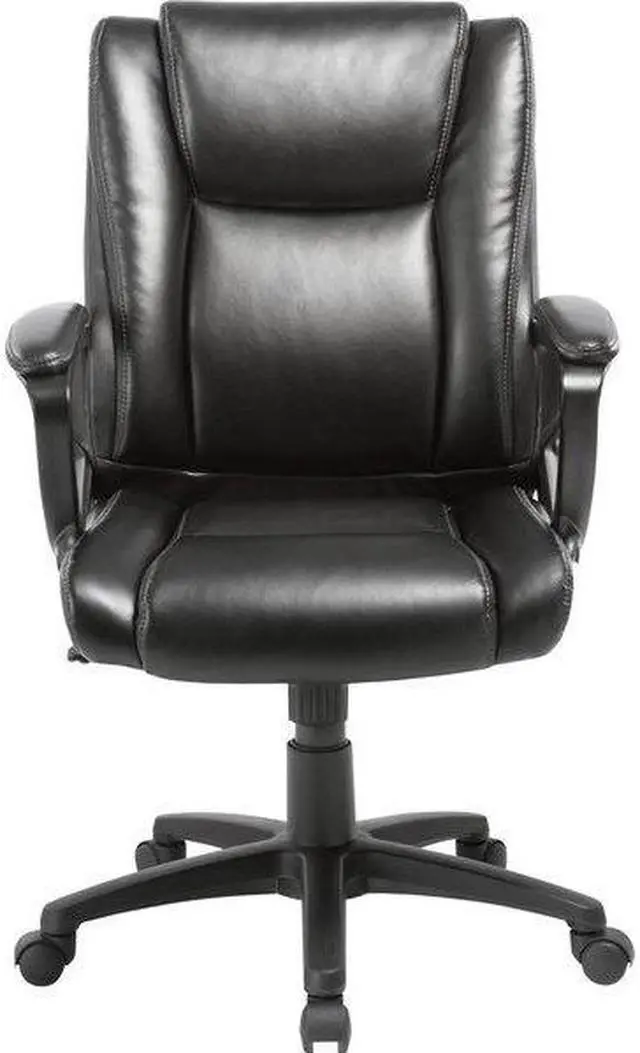 Lorell Soho High-back Leather Chair - Black Bonded Leather Seat - Black Bonded Leather Back - 5-star Base - 18.51" Seat Width - 26.4" Length x 24" Width x 24.8" Depth x 38.3" Height - 1 Each Rolling chair with fixed arms features a bonded leather exterior to provide timeless style that fits in nearly any room. Padded design offers comfortable support through extended periods of seating. Seat-height adjustment with tilt allows a variety of users to sit comfortably at their desk. 360-degree swivel allows you to effortlessly rotate the chair for added convenience.