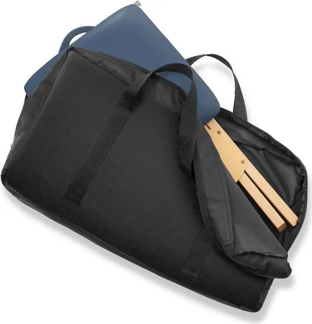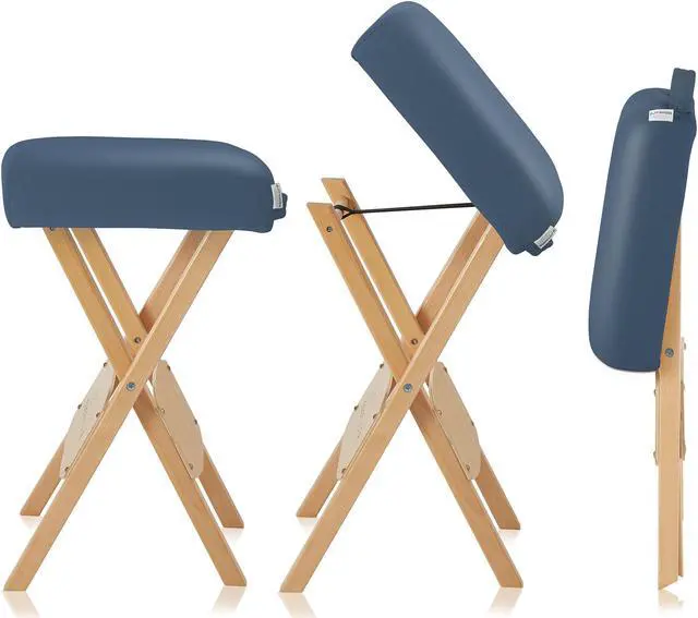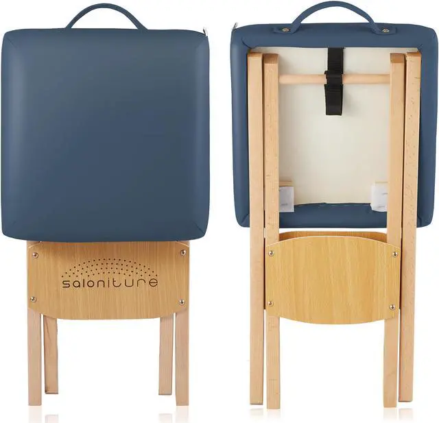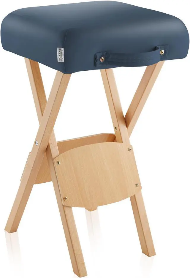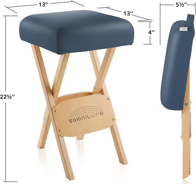 The Saloniture wood folding massage stool with carrying case features a padded seat composed of a plush, 2" thick layer eco-friendly, high-density foam providing ultimate durability and comfort. Lightweight yet sturdy construction in a streamlined design makes setup and breakdown a breeze, featuring a cushioned handle on the seat. The seat cover is made from a soft, highly durable vegan-friendly synthetic leather. Precision crafted from high-grade materials the stool features a beechwood base to accommodate a weight capacity of up to 250 lbs. Weighing just 5 pounds, the stool's compact design folds easily for transportation and storage into the included black nylon carry case with reinforced handles for easy travel.
