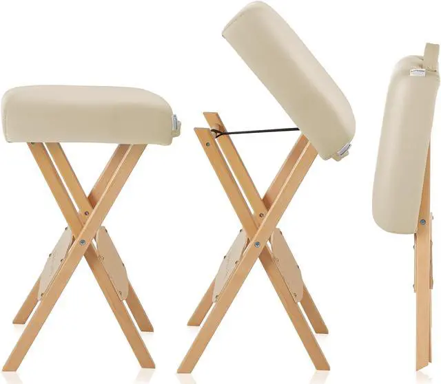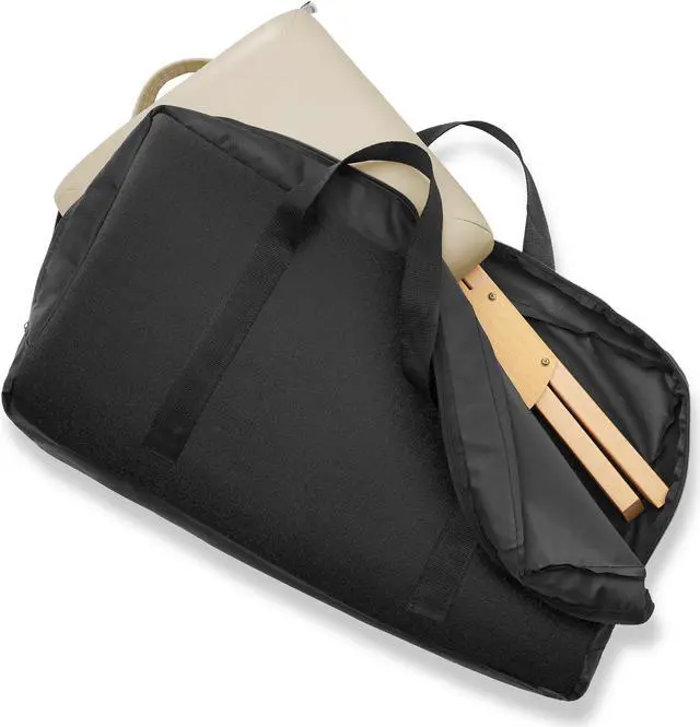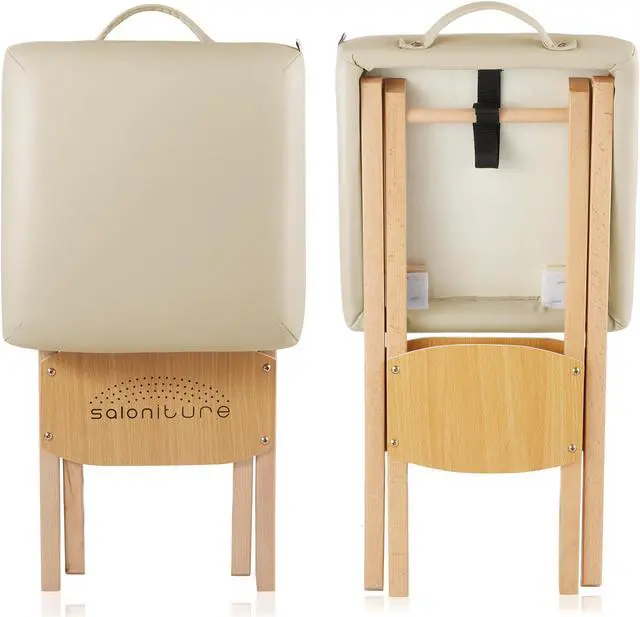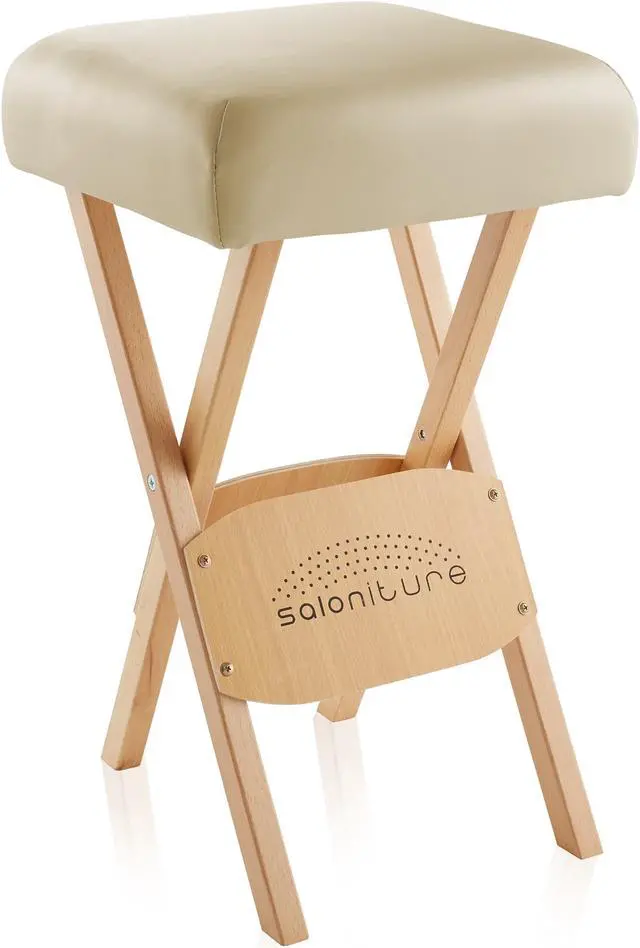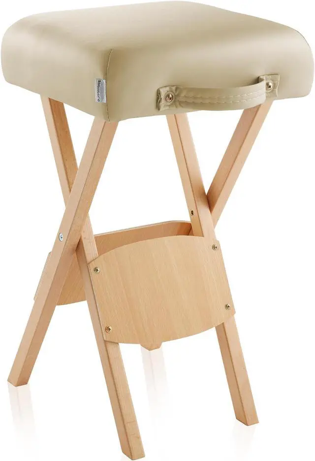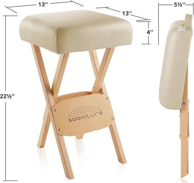 The Saloniture wood folding massage stool with carrying case features a padded seat composed of a plush, 2" thick layer eco-friendly, high-density foam providing ultimate durability and comfort. Lightweight yet sturdy construction in a streamlined design makes setup and breakdown a breeze, featuring a cushioned handle on the seat. The seat cover is made from a soft, highly durable vegan-friendly synthetic leather. Precision crafted from high-grade materials the stool features a beechwood base to accommodate a weight capacity of up to 250 lbs. Weighing just 5 pounds, the stool's compact design folds easily for transportation and storage into the included black nylon carry case with reinforced handles for easy travel.