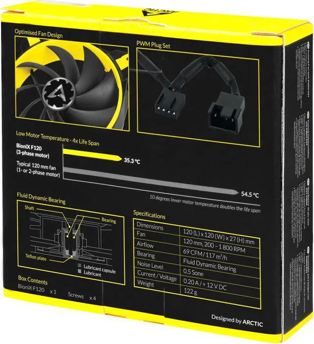 Low engine temperature - 4 times the service life: A 10 Degree C lower motor temperature doubles the lifetime. Because of the low coil temperature, the life span of the Bionix gaming fans is four times as long, so we extend the warranty to 10 years.