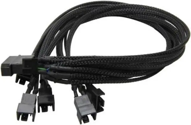 EverCool Molex to 5X 4 Pin PWM Fan Cables EC-DF001 PWM fans receive their spin rate orders from your PC's motherboard. If you have multiple PWM fans, you can use this cable to sync them up to spin at the same rate. One 4-pin connector allows the connected fan to provide RPM feedback to the motherboard. - Supports 5 PWM fans from a single motherboard PWM header - Black braided cable