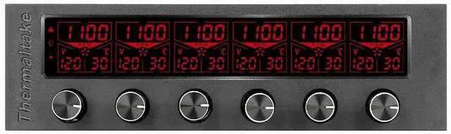 RGB LCD Screen (6) Voltage Control Knobs (6) Temperature Sensors Warning Alarm with Short Circuit Protection Compatible with up to (2) Lumi LED Strips 1 year warranty Style:RGB Fan Controller Take control of your cooling and temperature needs with the Commander F6 RGB LCD Fan Controller. Designed for single 5.25" drive bay applications, the Commander F6 shows off up to 16 different colors built-in to the RGB LCD panel. Control up to (6) fan simultaneously with (6) additional temperature sensors for total control over cooling and temperature monitoring. By changing the voltage from 0V - 12V users can read RPM, Voltages and Temperatures all from the front panel display. Built-in Warning alarms and Short Circuit Protection adds safety for component monitoring while the Commander adds (2) options for LED strip connection from the (6) Fan Headers (Optional). Keep cool and stay safe with the Commander F6 RGB LCD Fan Controller for a colorful look and cooling performance from Thermaltake.