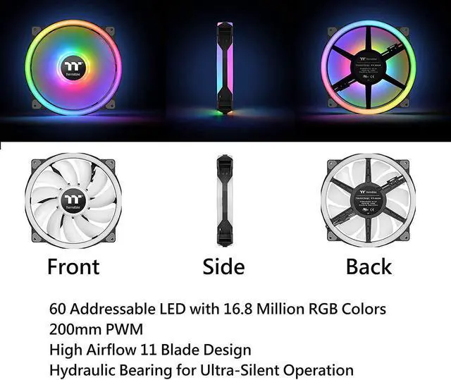 Thermaltake Riing Trio 20 RGB is the world’s first case fan with 3 independent 16.8 million colors LED rings design, featuring 60 addressable LEDs in total and supports Thermaltake’s patented TT RGB PLUS Software, Amazon Alexa Voice Service and Razer Synapse 3 (Razer Chroma). The fan itself utilizes a PWM controlled 200mm high-static pressure fan, long-life hydraulic bearing and compression fan blade design, delivering remarkable cooling performance without sacrificing quiet operation – “Three-of-a-kind always beats two pair, Riing Trio! ”