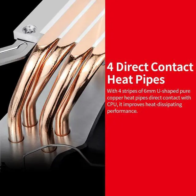 Feature: Efficient Heat Dissipation With aluminium fin neatly arranged, it owns great ability to dissipate heat. Through Fin Technology The heat pipes are designed to pass though aluminium fins, increasing their contacting area, thus improving heat-dissipating efficiency. 4 Direct Contact Heat Pipes With 4stripes of 6mm U-shaped pure copper heat pipes direct contact with CPU, it improves heat-dissipatingperformance. Easy to Install The fan adopts buckle installation, which is easy to install and remove. And with 4 padsapplied on the feet of the fan, it is anti-vibration. 120mm PWM Fan The rotating speed of the fan will change according to the temperature of the CPU, saving more energy and can be used for a longer time than the common fan. Quiet operation Durable It adopts hydraulic bearing, makingit more durableand works more quietly.