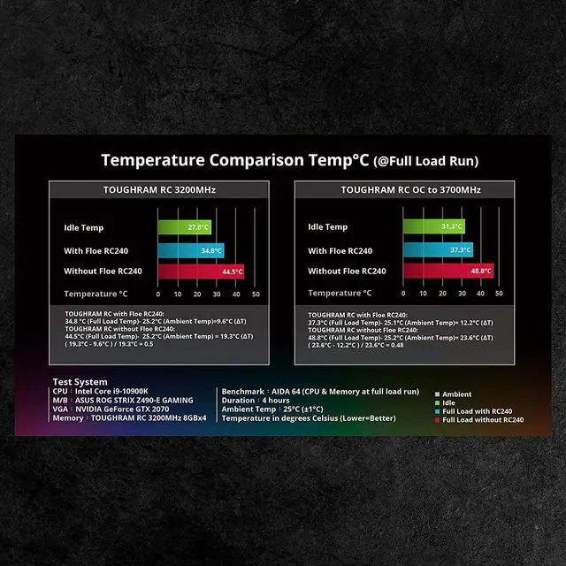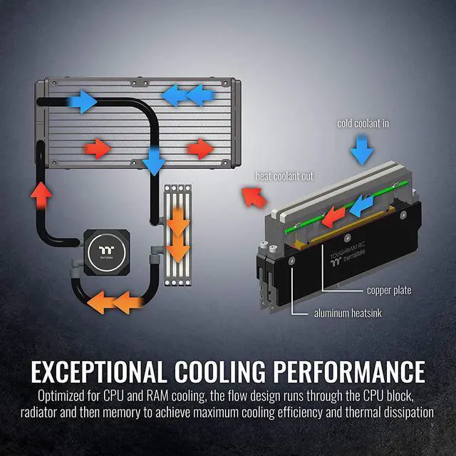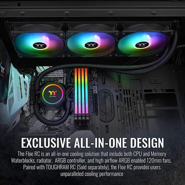 The Floe RC is a high-quality all-in-one cooling solution optimized for CPU and RAM cooling. The flow design runs through the CPU block, radiator and then memory to achieve maximum cooling efficiency and thermal dissipation. The Floe RC supports motherboards equipped with a 5V addressable RGB header, allowing you to control color and lighting effects through their respective software. Compatible only with Thermaltake TOUGHRAM RC memory modules, the Floe RC provides a simple and intuitive all-in-one solution that grants users unparalleled cooling performance.