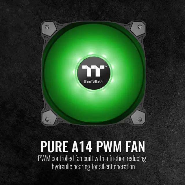 Pure A14 PWM controlled fans come with 4 color options including red, blue, green and white. Designed for radiator cooling, the Pure A14 LED fans incorporate 9 LEDs, long life hydraulic bearings for silent operation and anti-vibration dampening foam which minimizes vibration and sound.P/N:CL-F110-PL14GR-AFAN DIMENSION: 140 x 140 x 25 mmINTERFACE: 4 PIN PWMSYSTEM COMPATIBILITY: Windows 7 / 8 / 8.1 / 10FAN STARTED VOLTAGE: 9.0 VFAN RATED VOLTAGE: 12 VRATED CURRENT: 0.27 A (one fan)POWER INPUT: 3.24 W (one fan)FAN SPEED: PWM 500 1500 R.P.MMAX. AIR PRESSURE: 2.05 mm-H2OMAX AIR FLOW: 93.15 CFMNOISE: 32 dB-ABEARING TYPE: Hydraulic BearingLIFE EXPECTATION: 40,000 hrs,25?WEIGHT: 176 g